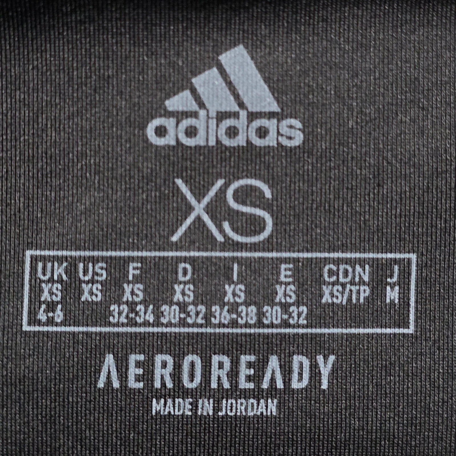Adidas 7/8 length tight-fit leggings, women’s XS. Black with classic 3-Stripe detailing, pull-on waist, moisture-wicking Aeroready fabric helps you stay dry. Very stretchy and ideal for workouts or casual athleisure.