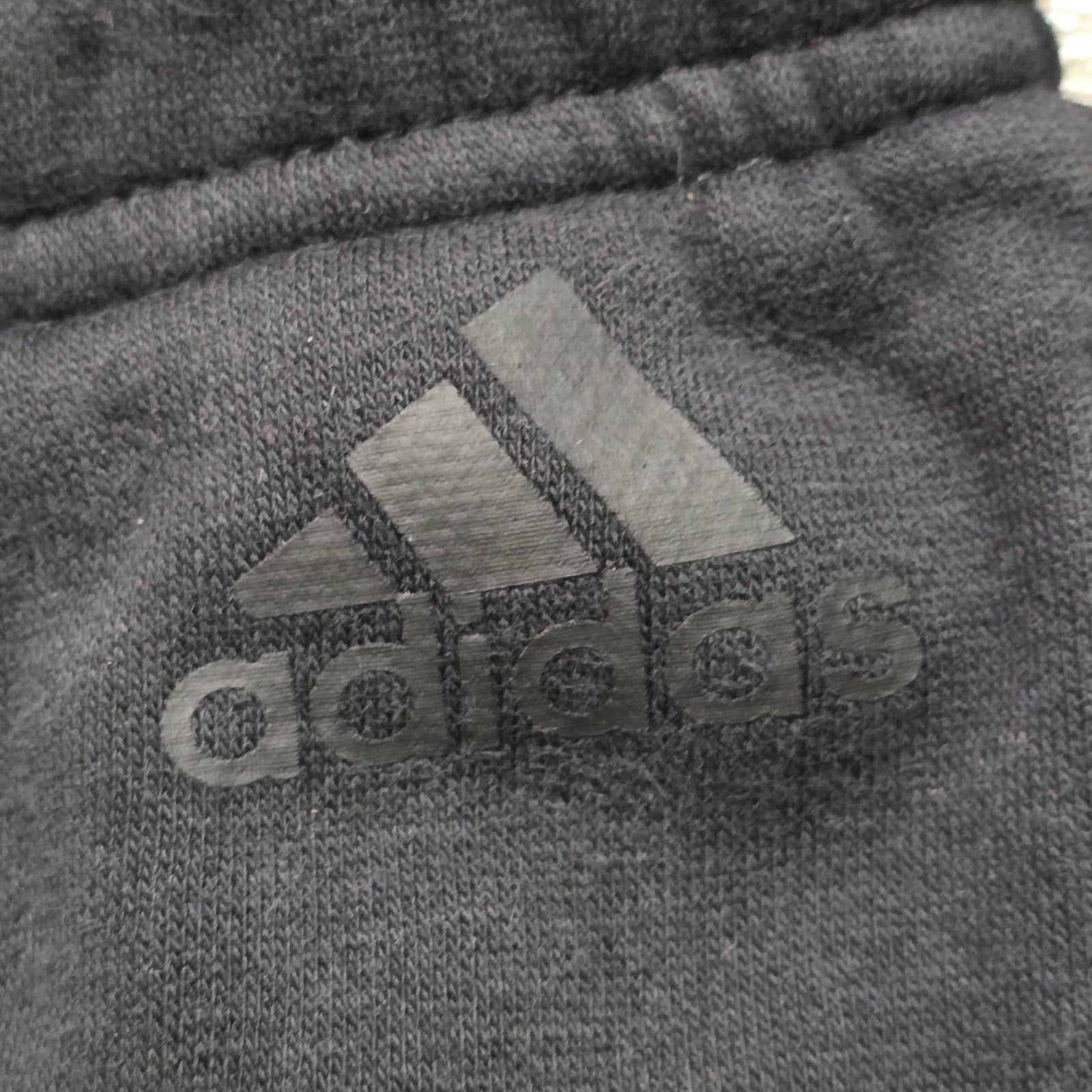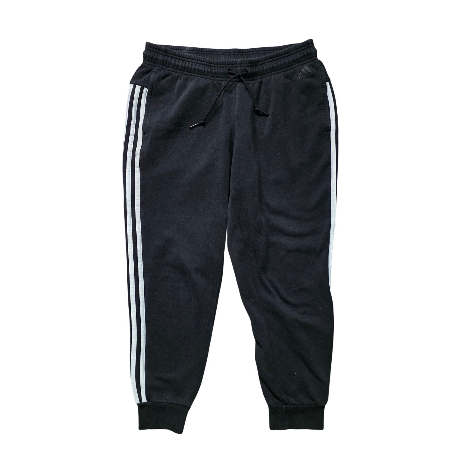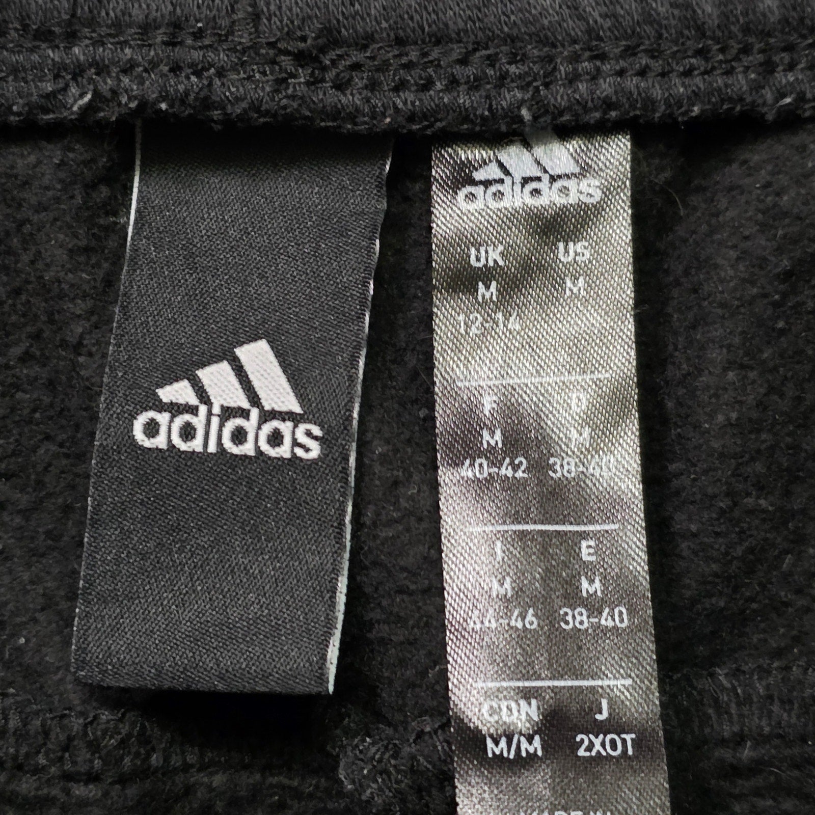 Adidas Essentials fleece jogger pants in black, size medium. Features white 3-stripes down the sides, elastic waistband with drawcord, and ribbed cuffs. Great for casual wear, lounging, or athletic style.