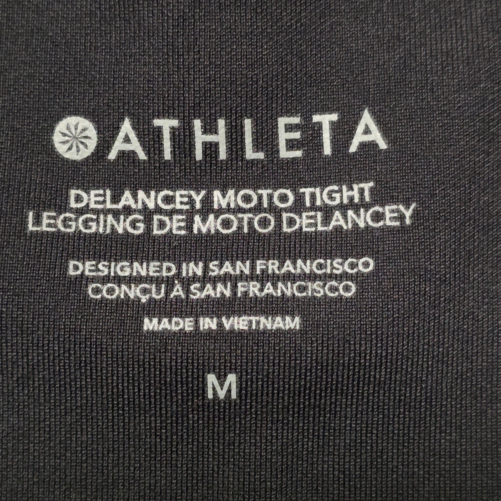 Athleta Delancey moto tight leggings in size medium. Sleek black design with moto-inspired paneling, stretchy and supportive fabric that’s great for workouts, yoga, or everyday athleisure style.