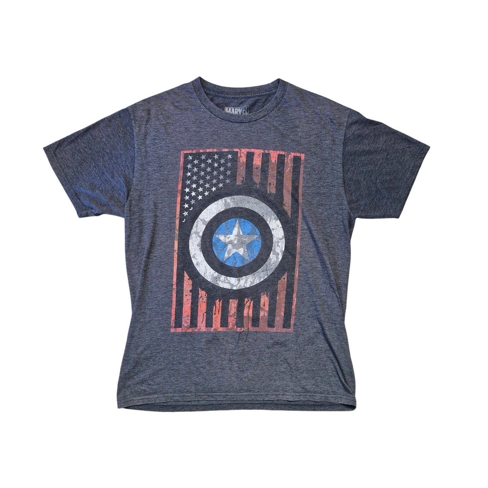 Men’s Captain America graphic t-shirt in size Large. Features the iconic shield graphic on a soft heather gray cotton-blend tee. Crew neck, short sleeves, and classic superhero style perfect for Marvel fans or casual everyday wear.