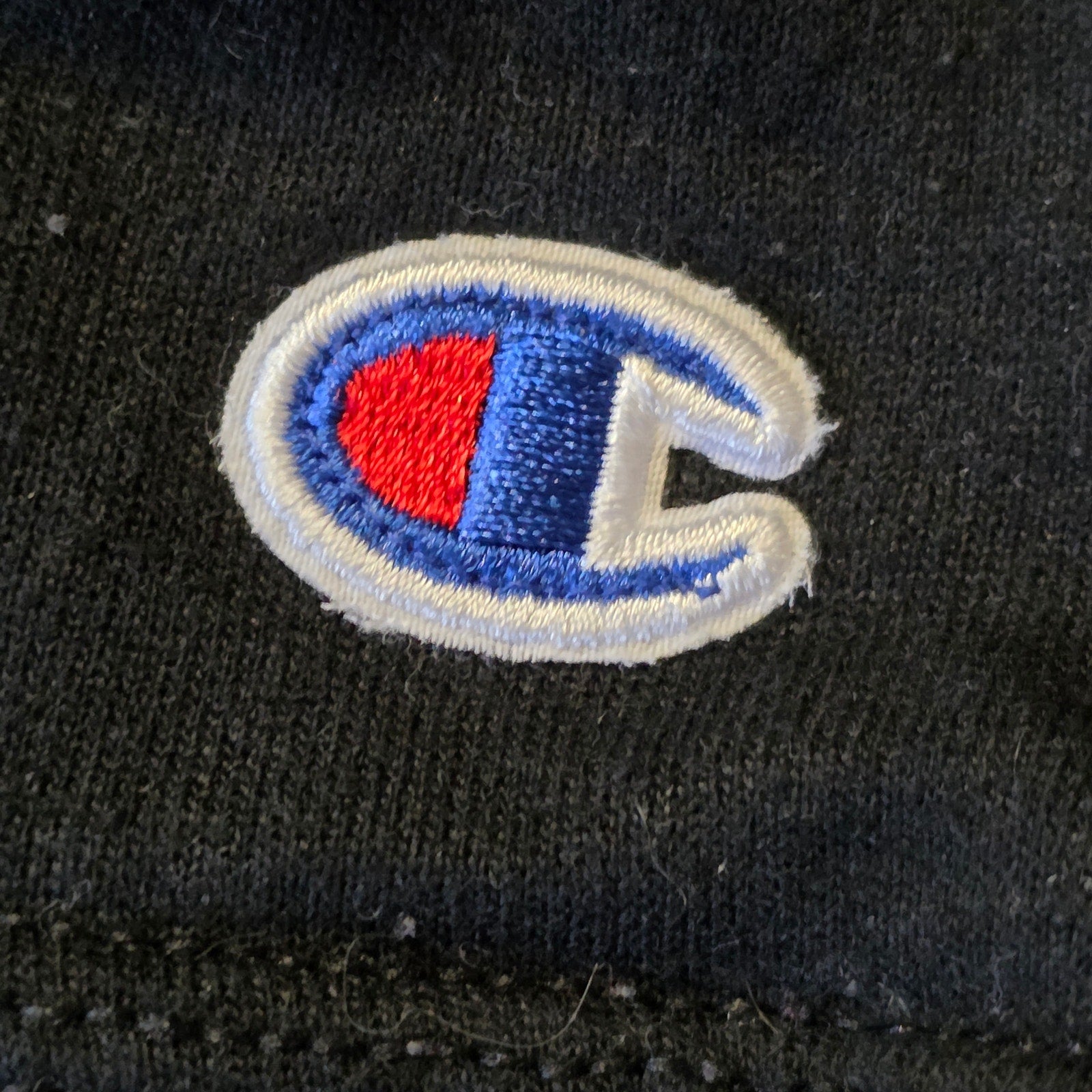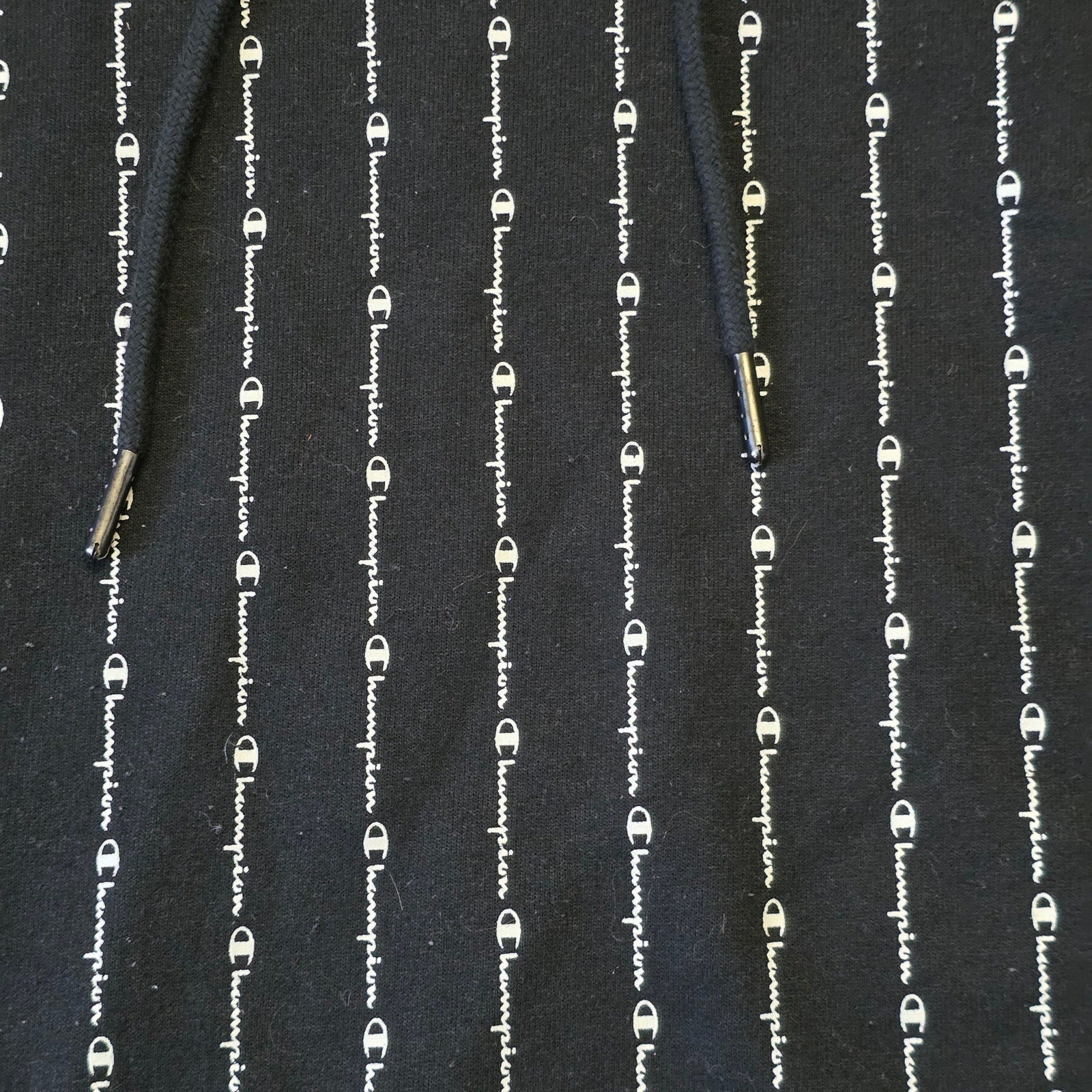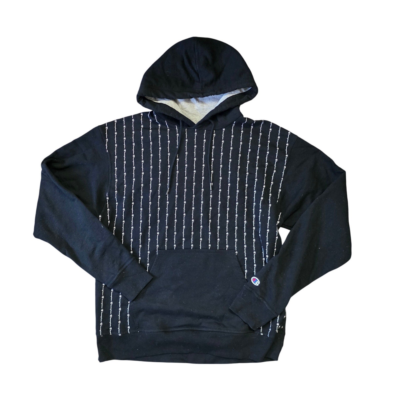 Champion pullover hoodie in black with bold white vertical brand name stripes down the sleeves. Soft cotton blend with kangaroo pocket and adjustable drawstring hood. Great for casual wear, lounging, or layering.