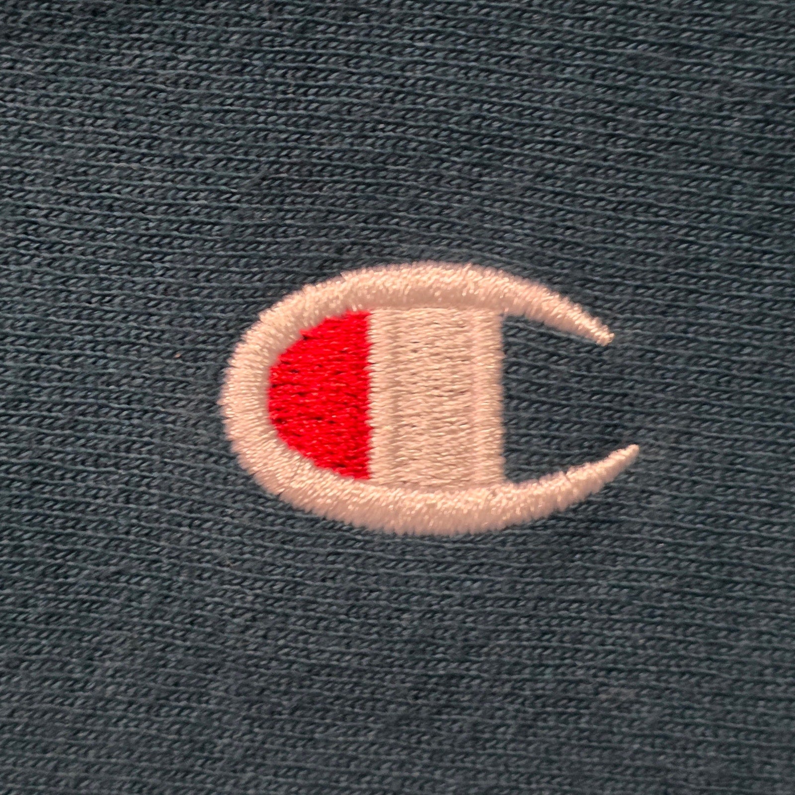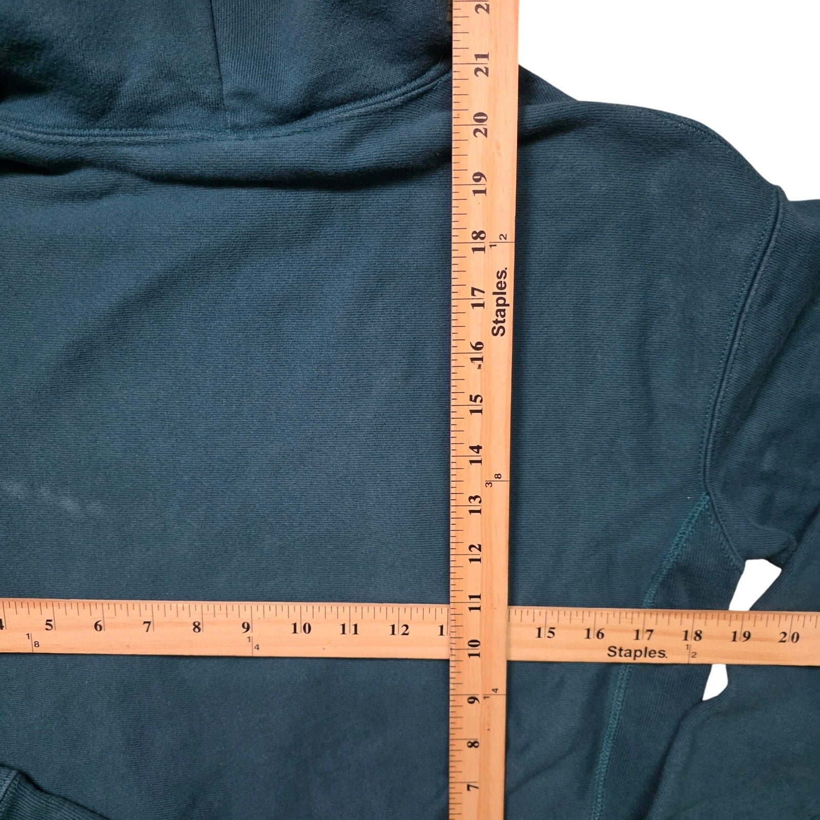 This Champion Reverse Weave hoodie (men’s size S) is heavyweight cotton blend, turquoise blue with classic ribbed cuffs and band, and has a small mark on the back—it’s still solid quality, fits roomy in the body, great for streetwear or layering.