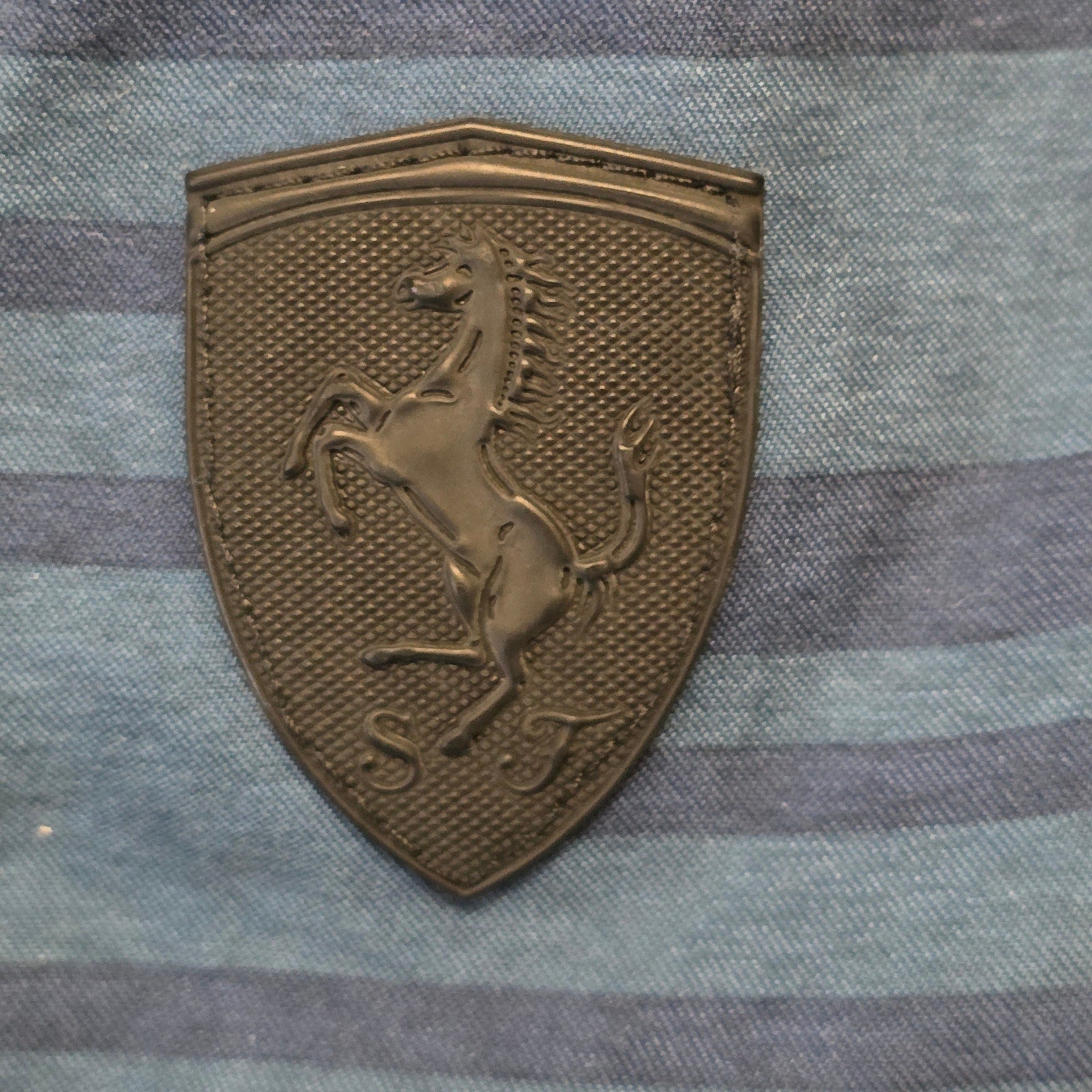 Stylish Ferrari swim trunks with blue camo pattern and iconic prancing horse shield logo on the leg. Features an elastic drawstring waistband, mesh lining, side pockets, and secure zip pocket. Ideal for beach, pool, or casual summer wear.