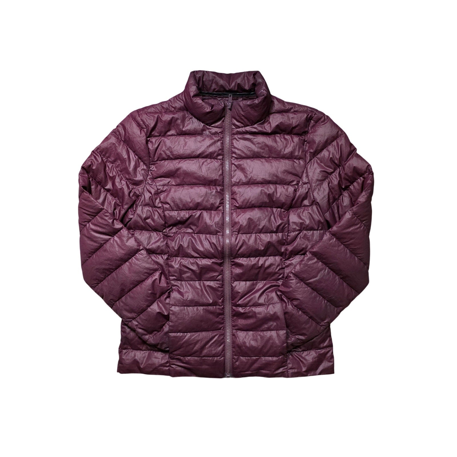 This H&M lightweight down puffer jacket in women’s size S is filled with down-blend insulation, offers a cozy feel without bulk, and features a full zip front and burgundy shell that layers well for chilly mornings or travel.