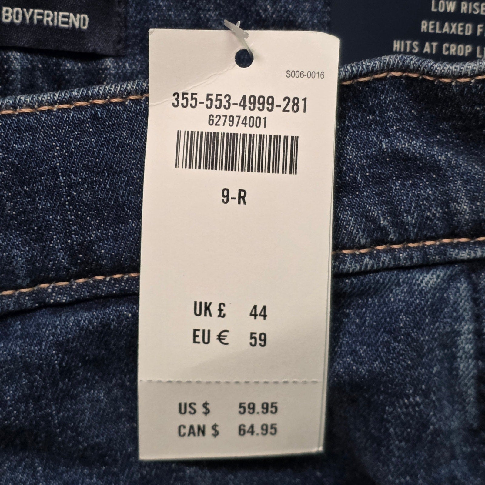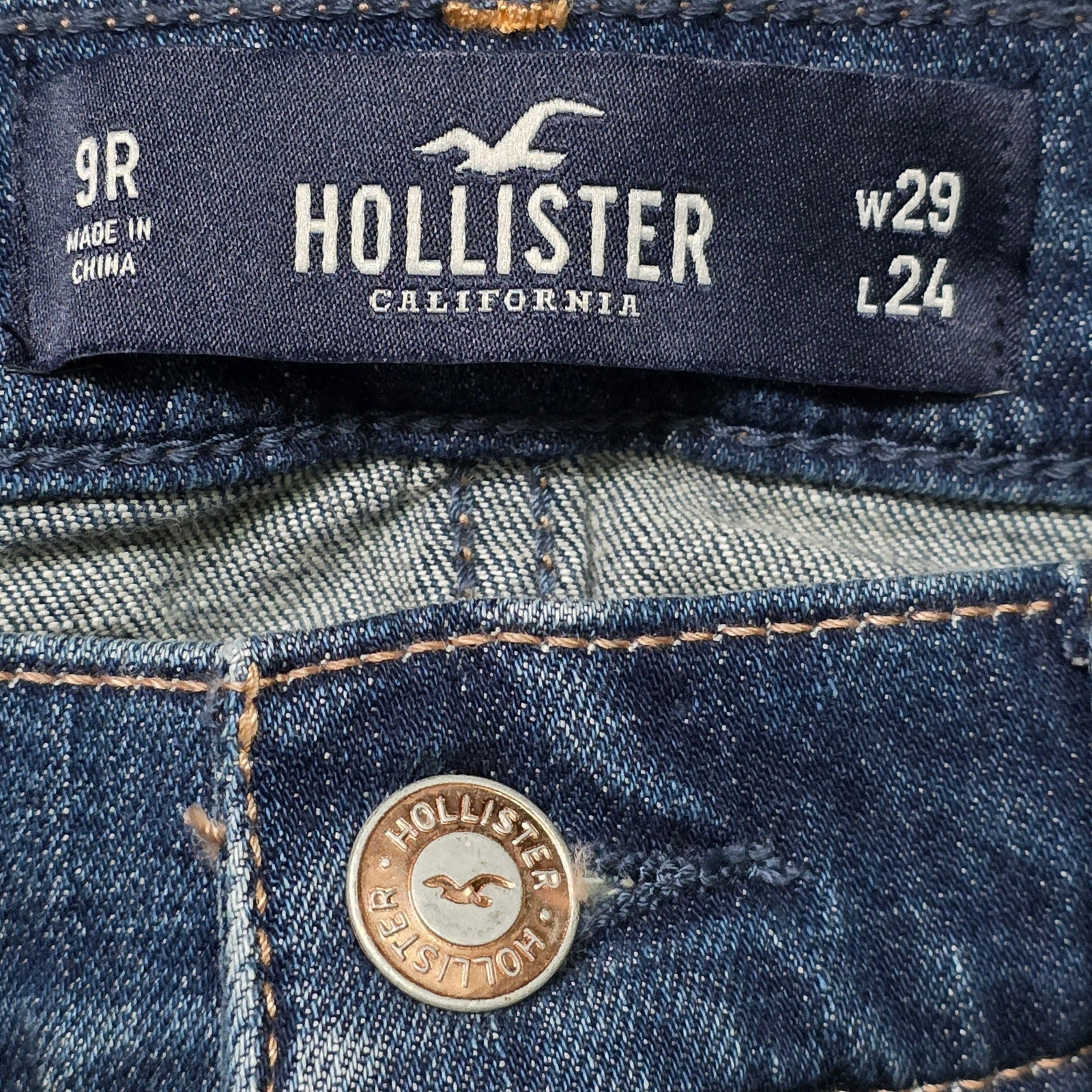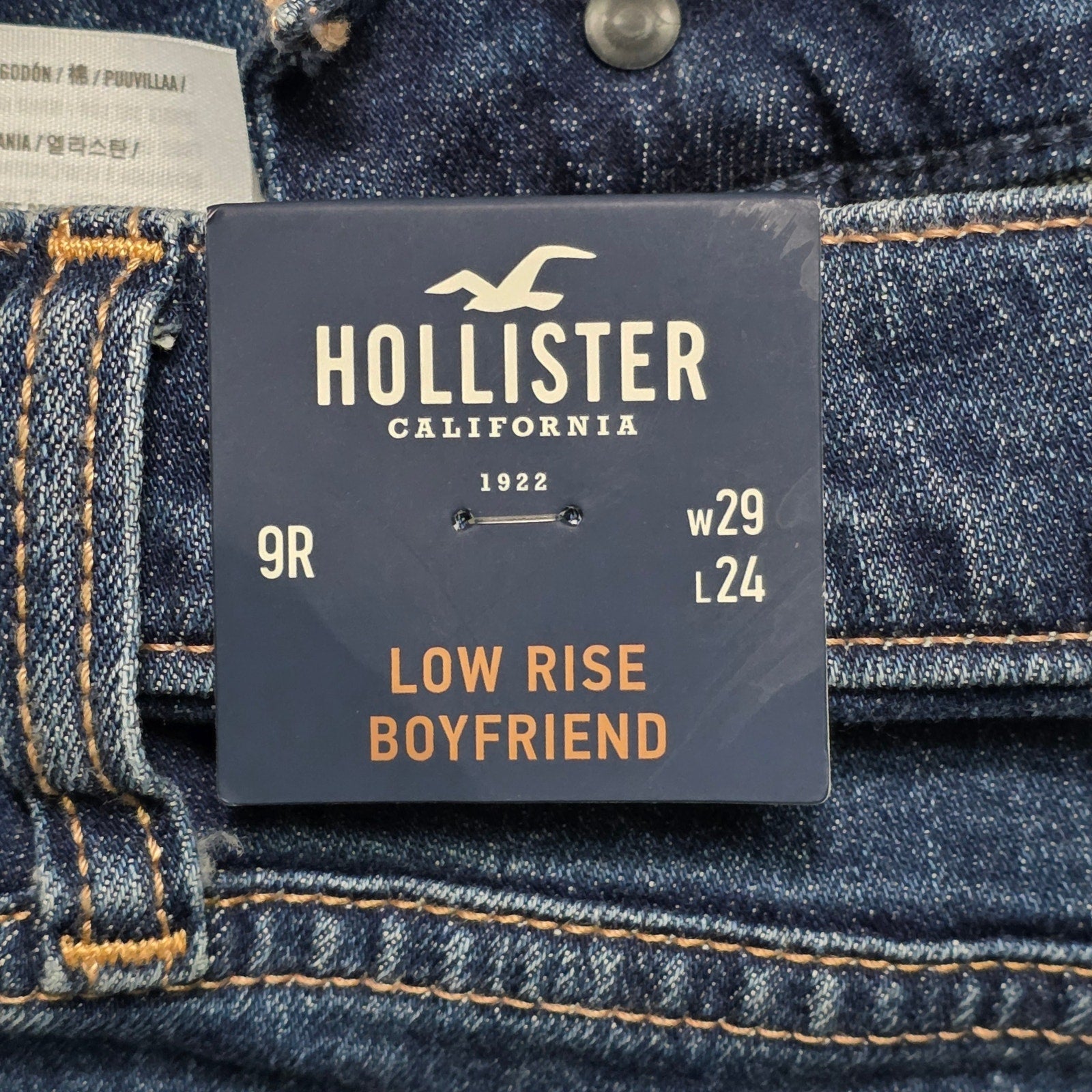 A Hollister low rise boyfriend jean in blue with distressed detailing, size 9R (29 waist, 24 inseam). These are brand new with tags, ready to wear.