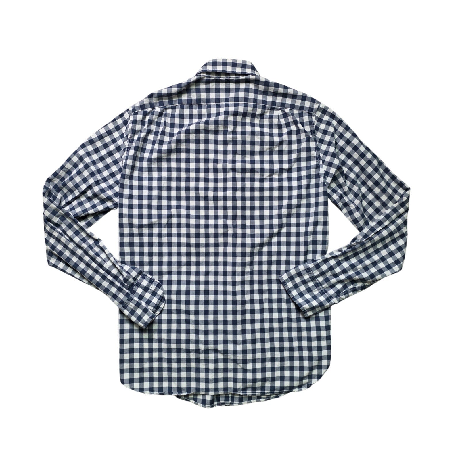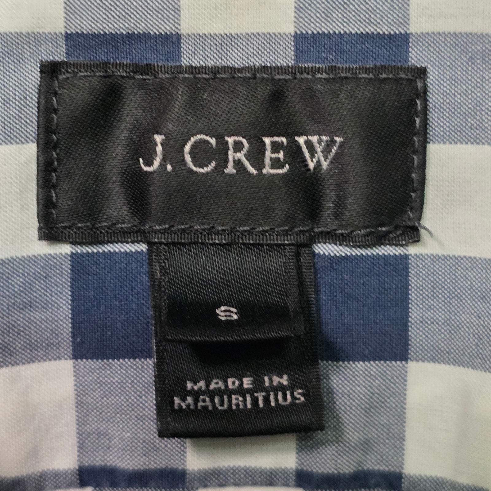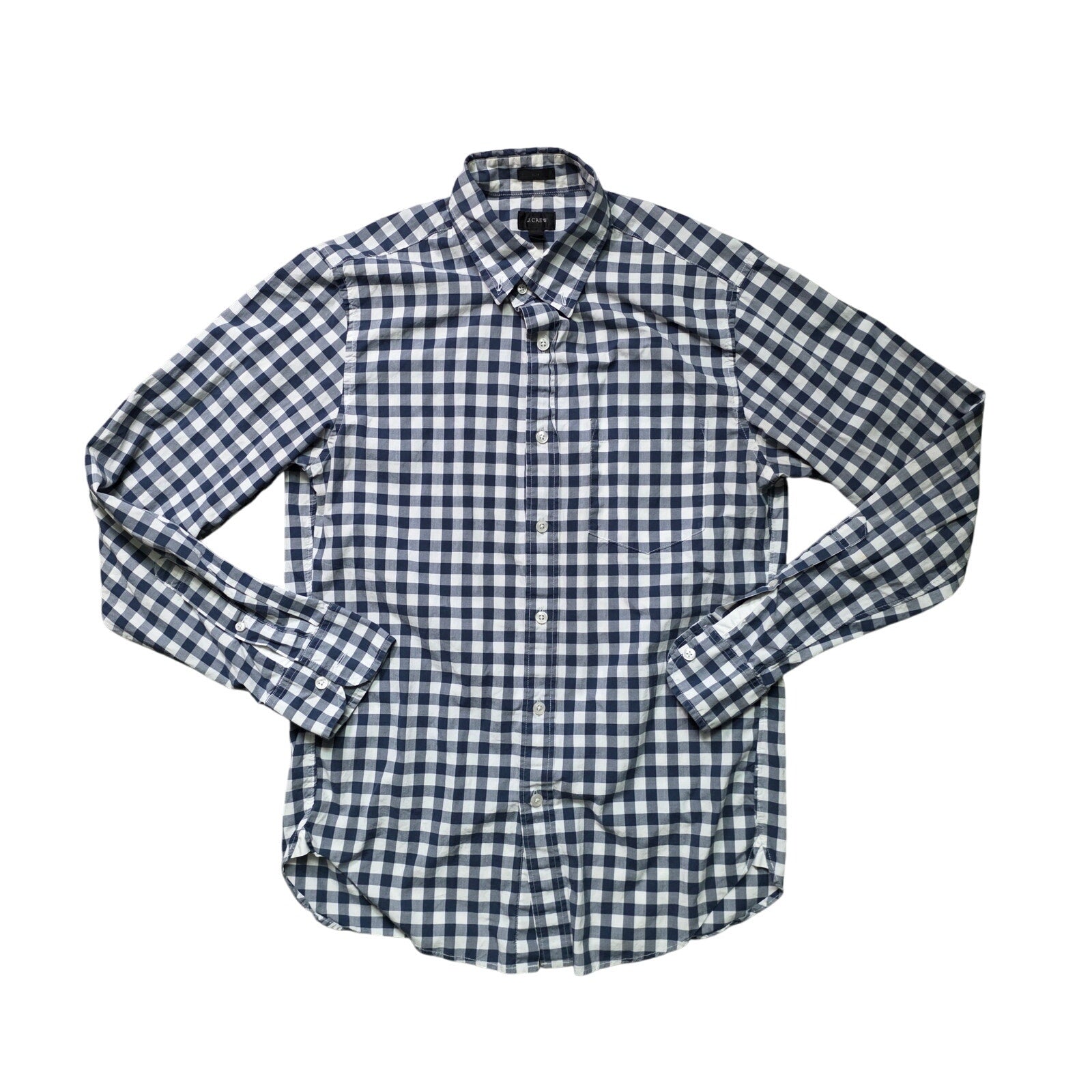 Classic J. Crew slim fit button-down shirt in blue gingham. Tailored silhouette with a crisp collar and soft cotton blend, perfect for smart casual or business looks.