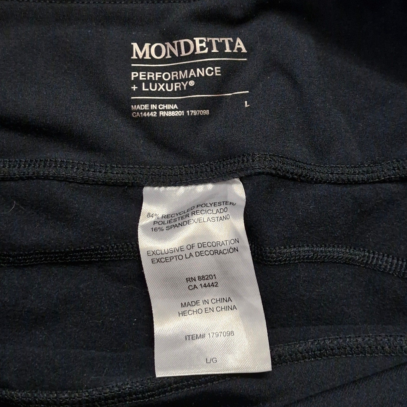 Mondetta brushed jacquard leggings in black, women’s size Large. Soft textured stretch fabric with two side pockets and a wide high-rise waistband for support. Great for gym, yoga, or casual wear.