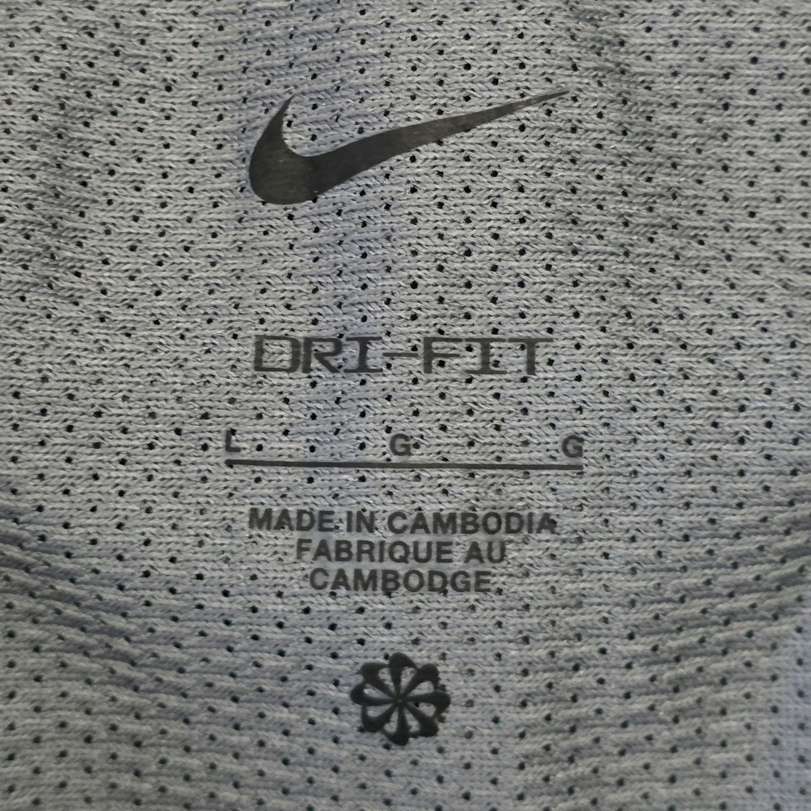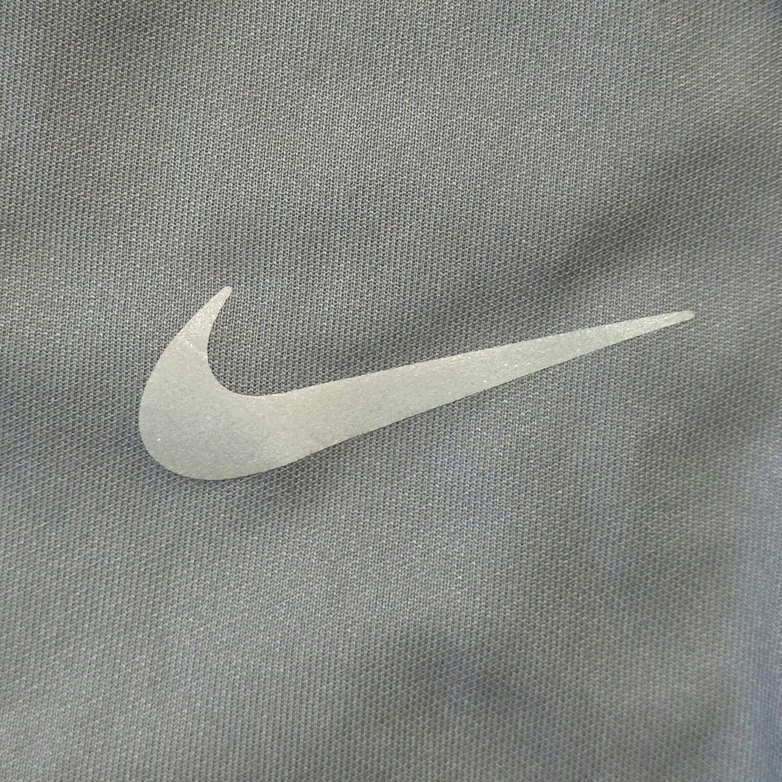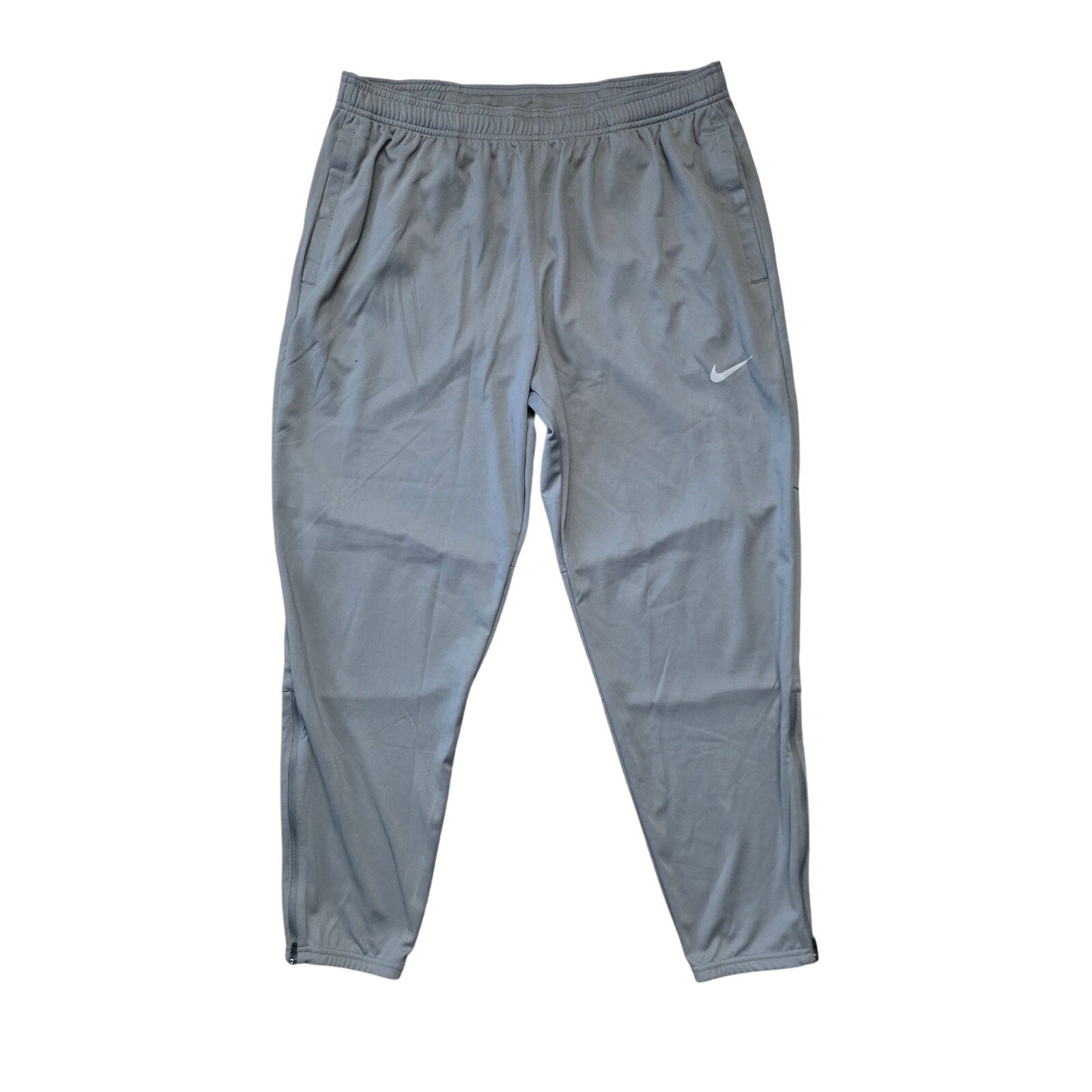 Lightweight Nike Dri-FIT Challenger pants in gray size large, made with breathable performance fabric. Elastic waistband with drawcord and zippered pockets make them great for running, warm-ups, or casual athletic wear.