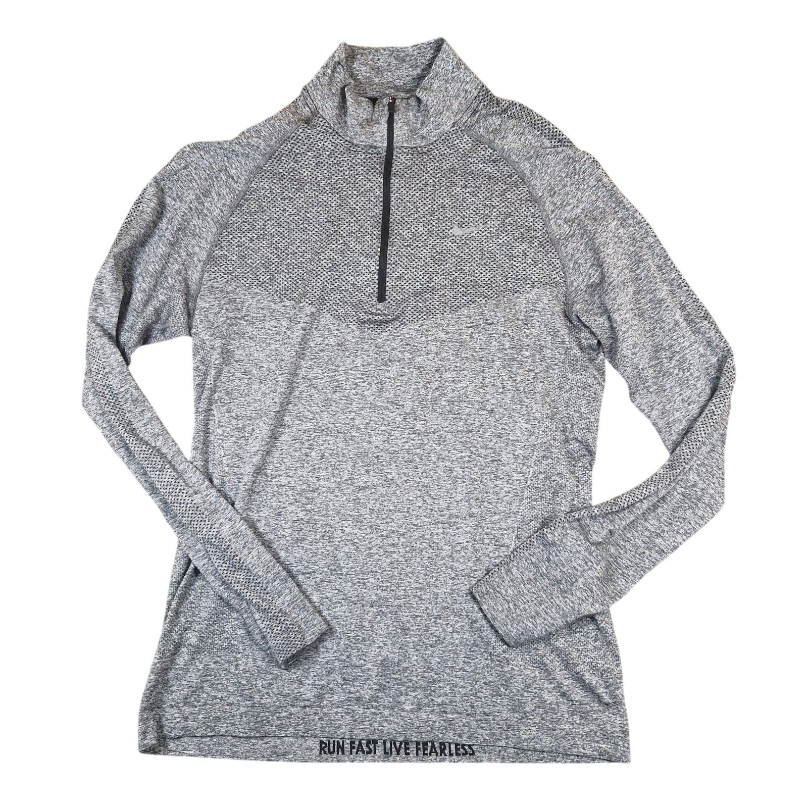 Nike Dri-FIT quarter zip running top in size Medium. Features “Run Fast Live Fearless” text on the sleeve, thumb holes, and a stand collar. Lightweight and breathable perfect for cool morning runs or layering. Pre-owned, no stains, tears or flaws.