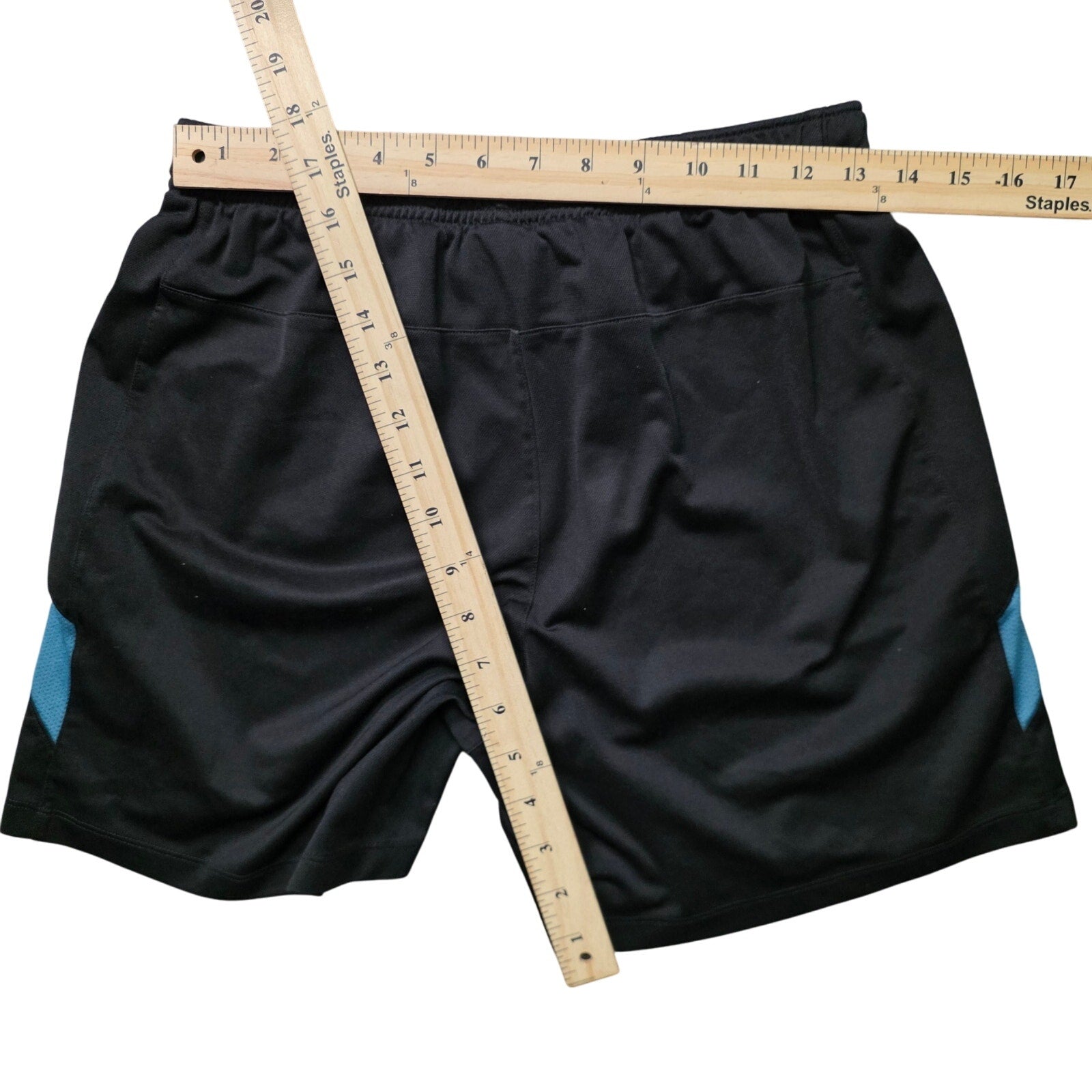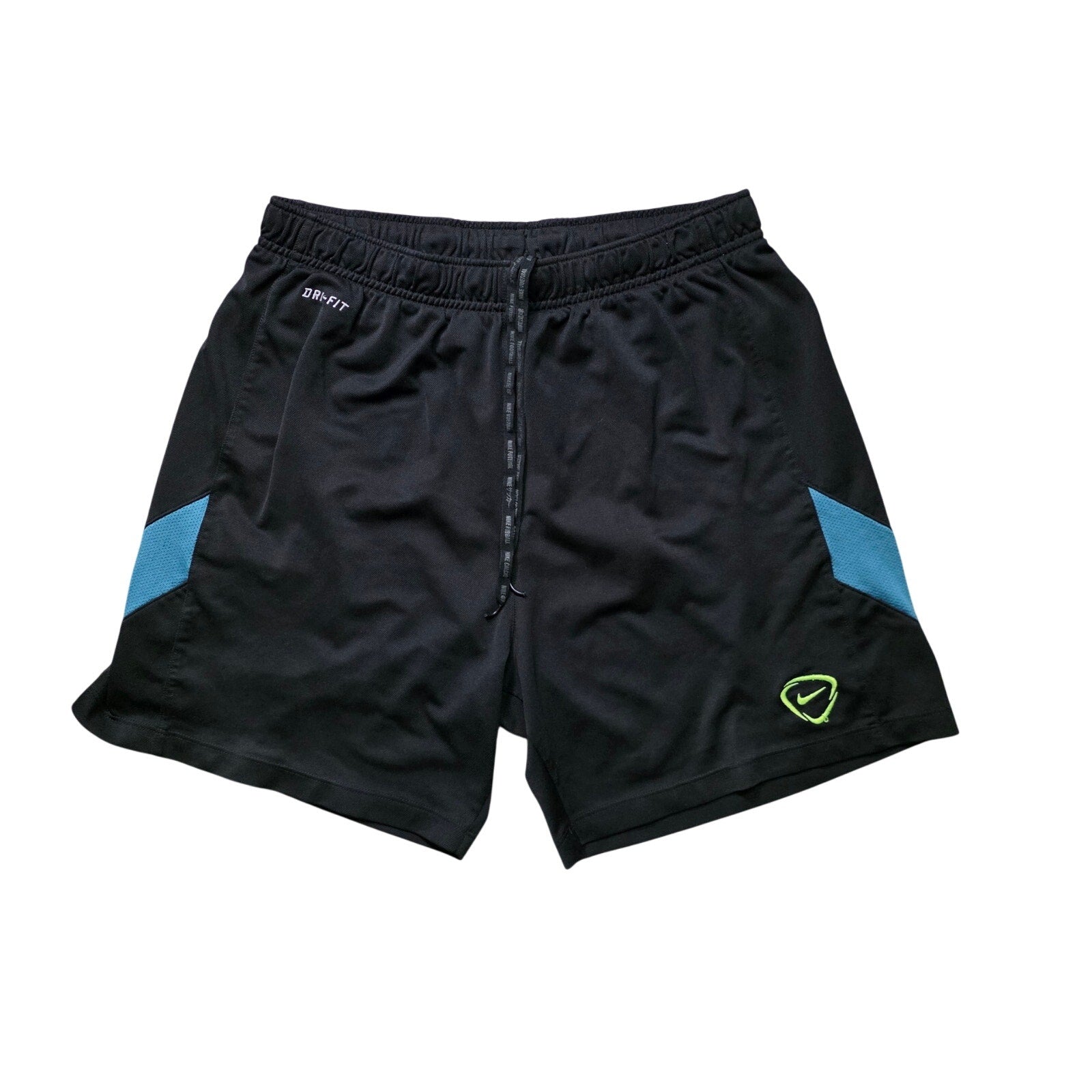 These vintage Nike soccer shorts are made from shiny satin-nylon, in men’s size L, black with blue accents and the classic Swoosh logo—lightweight, with a retro flair that works for casual wear or throwback sport style. Pre-owned, in good condition with no stains or tears (see photos). Due to lighting and camera, colors in photos may not be 100% accurate. Color may slightly vary.