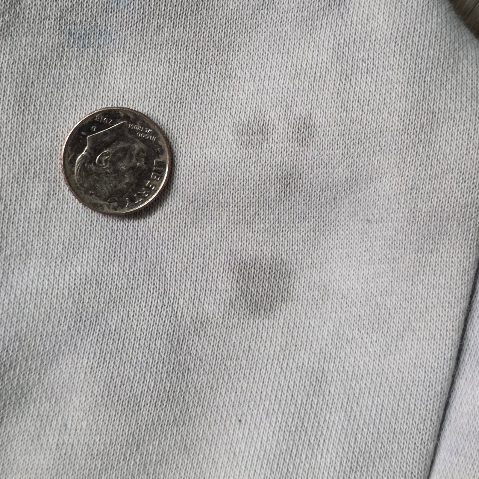 Pre-owned, gently used. Small hole (see photo) and a faint stain (shown)