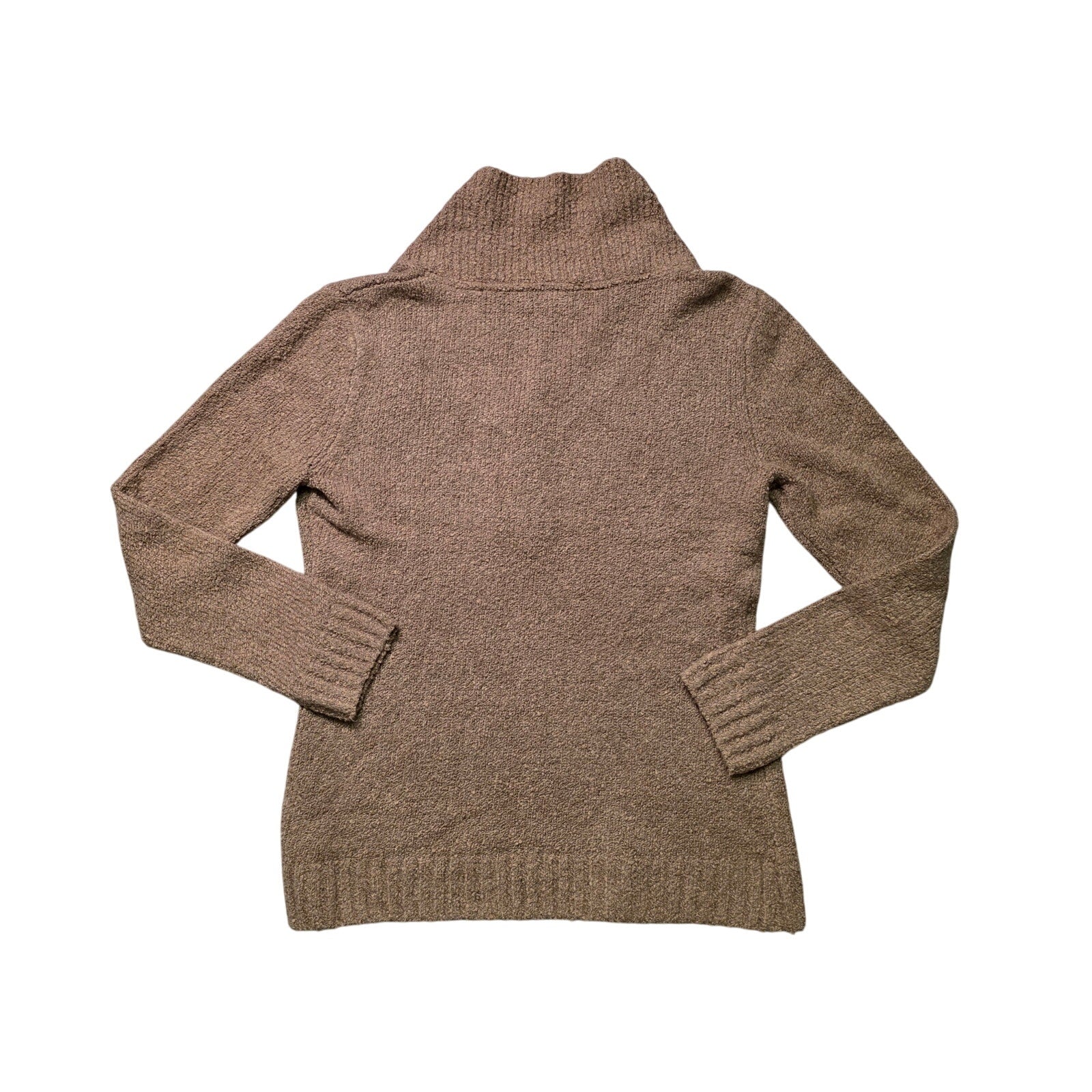 Soft and cozy Orvis women’s knit sweater in a medium brown shade. Features a classic V neck henley style with button details and a comfortable pullover fit, perfect for casual wear or layering.