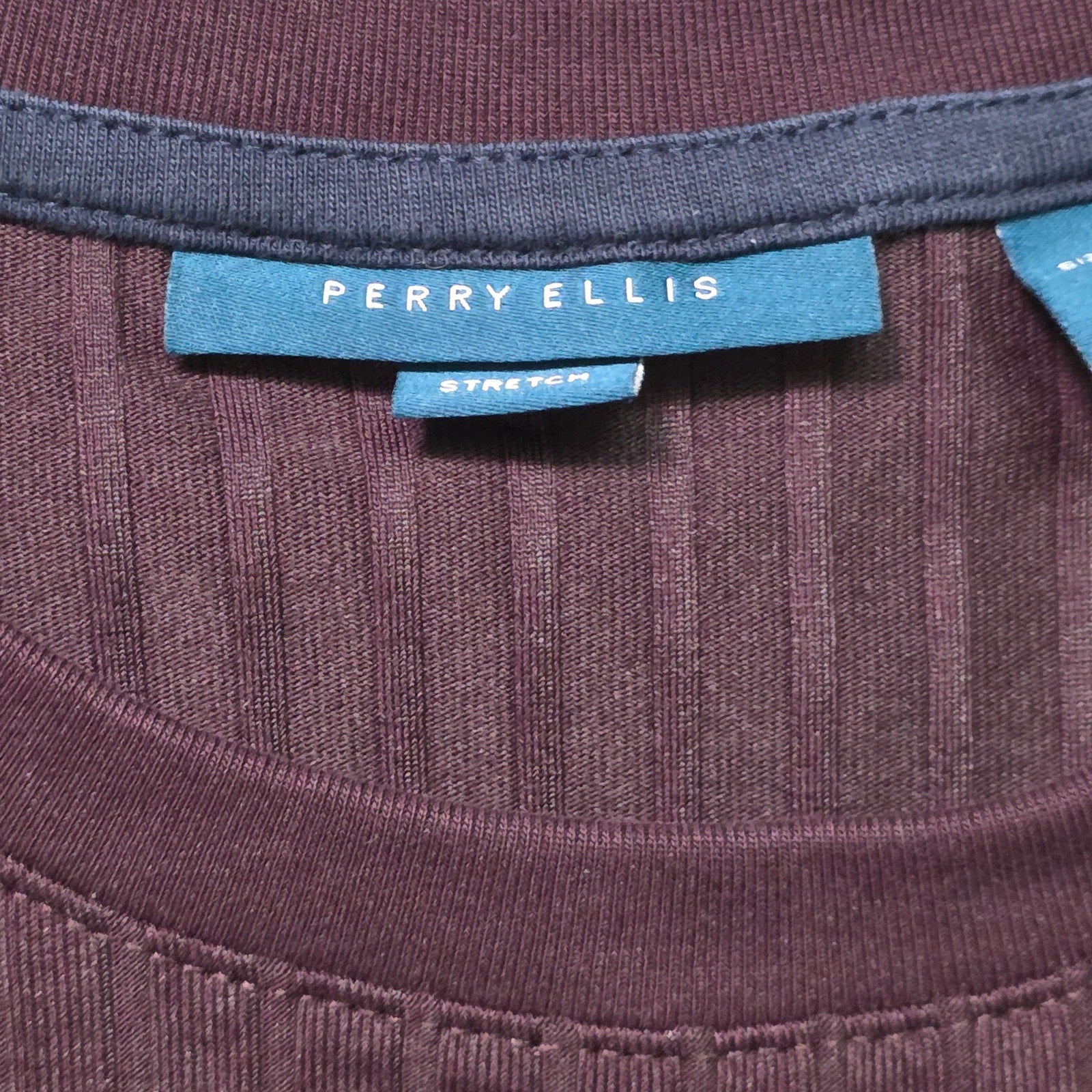 Classic Perry Ellis men’s rib knit tee in maroon, size small. Soft cotton stretch fabric with crew neck design, perfect for layering or casual everyday wear.