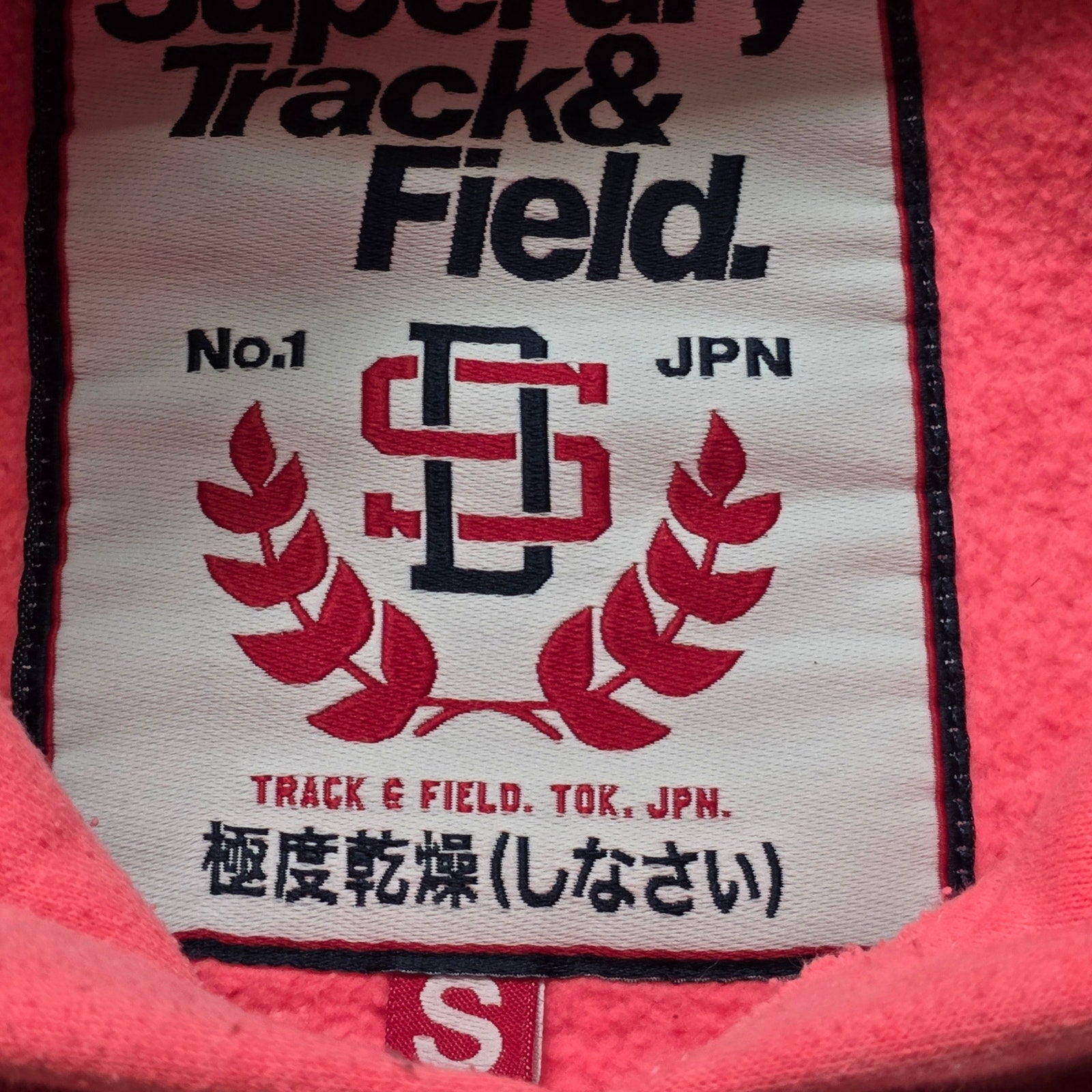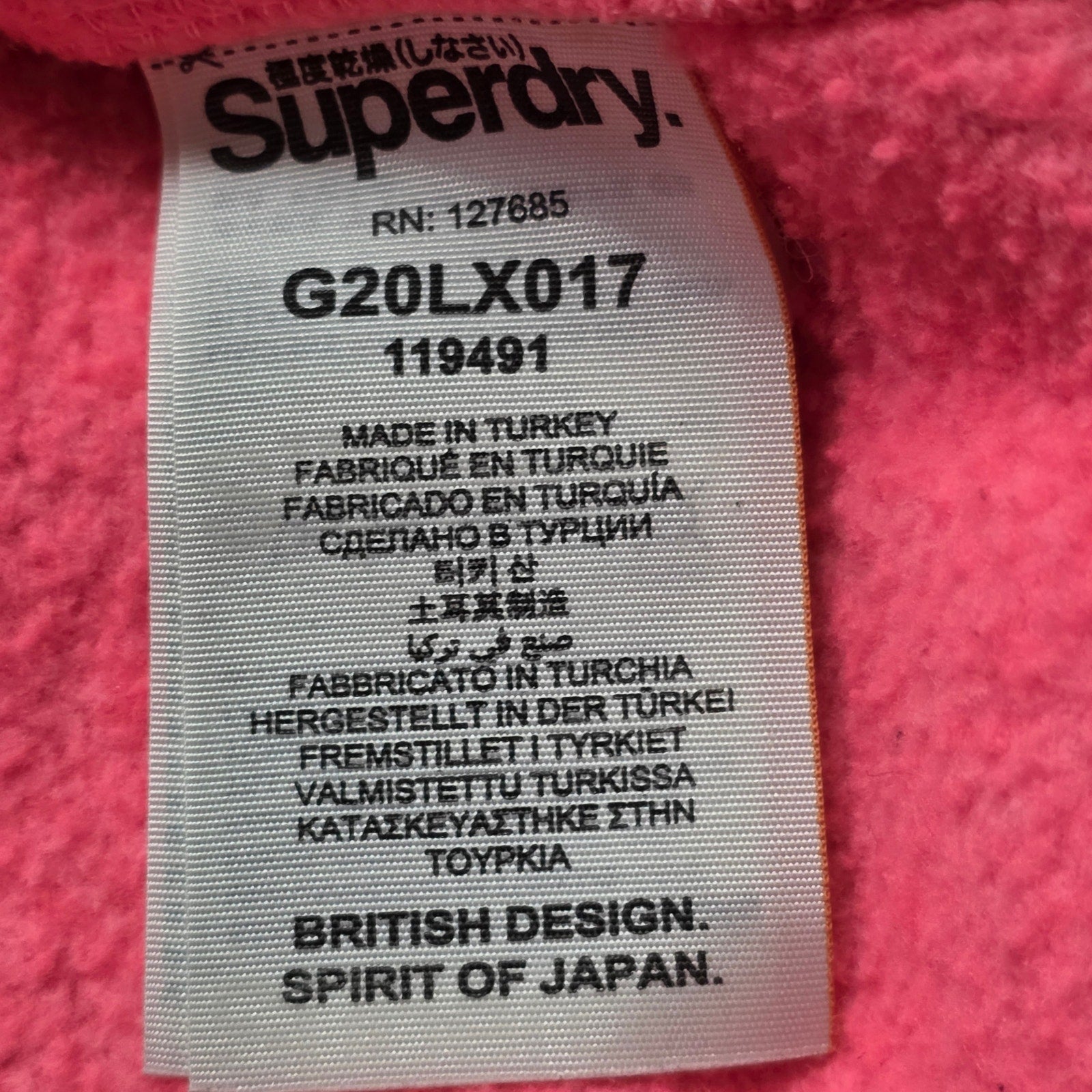 Cozy Superdry hoodie in pink, women’s size small. Athletic / track & field style, with logo details.