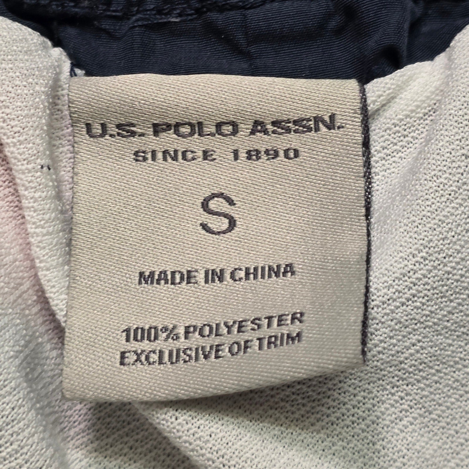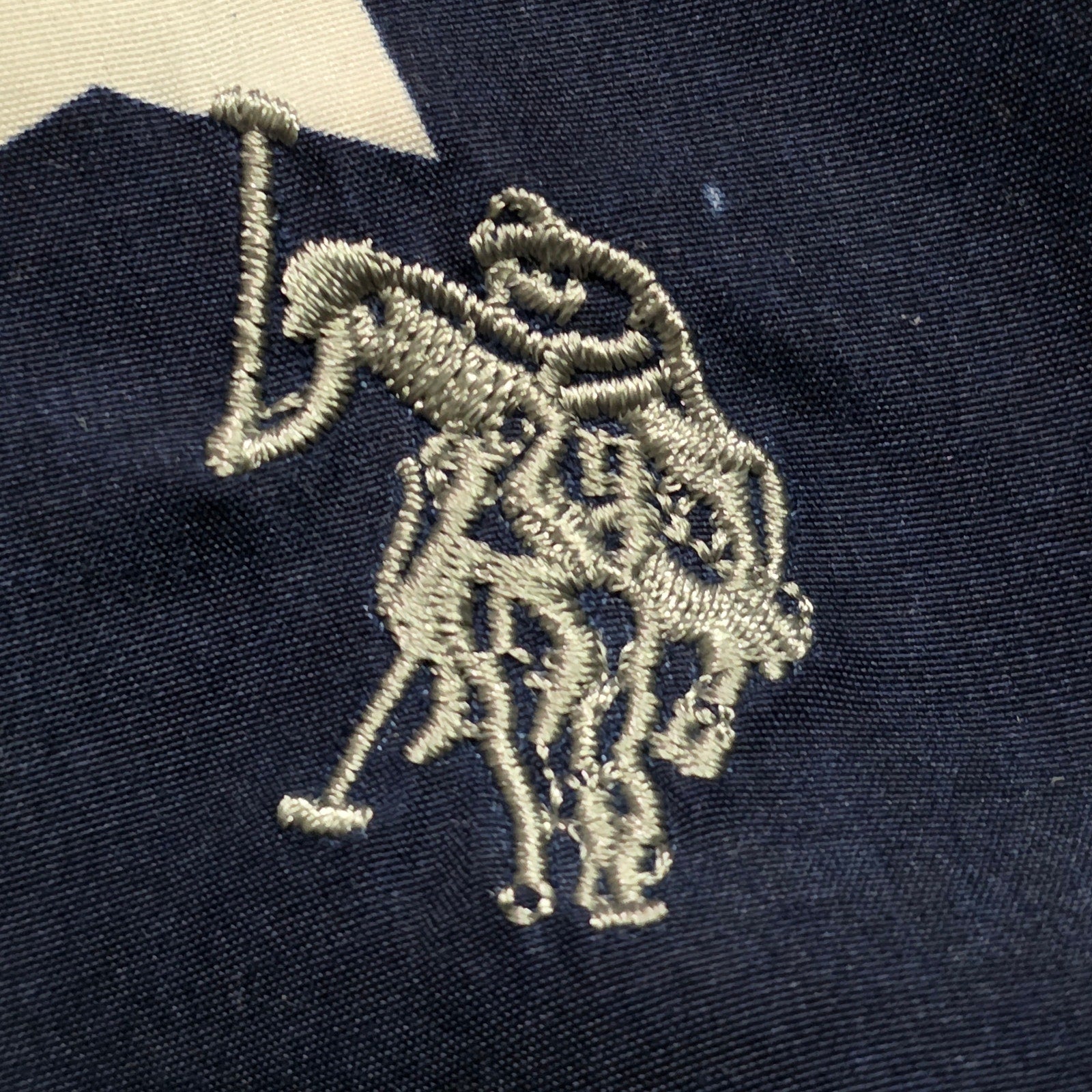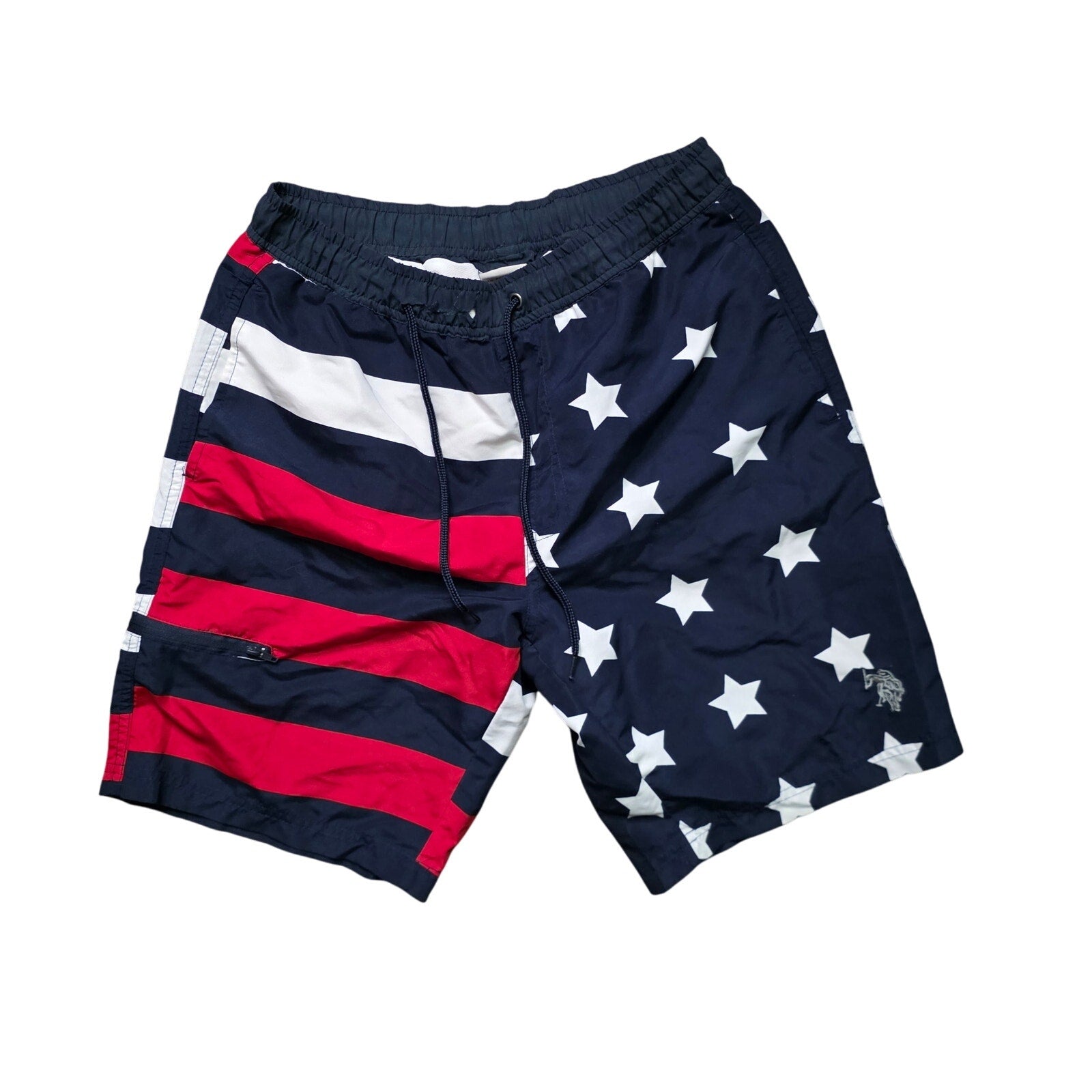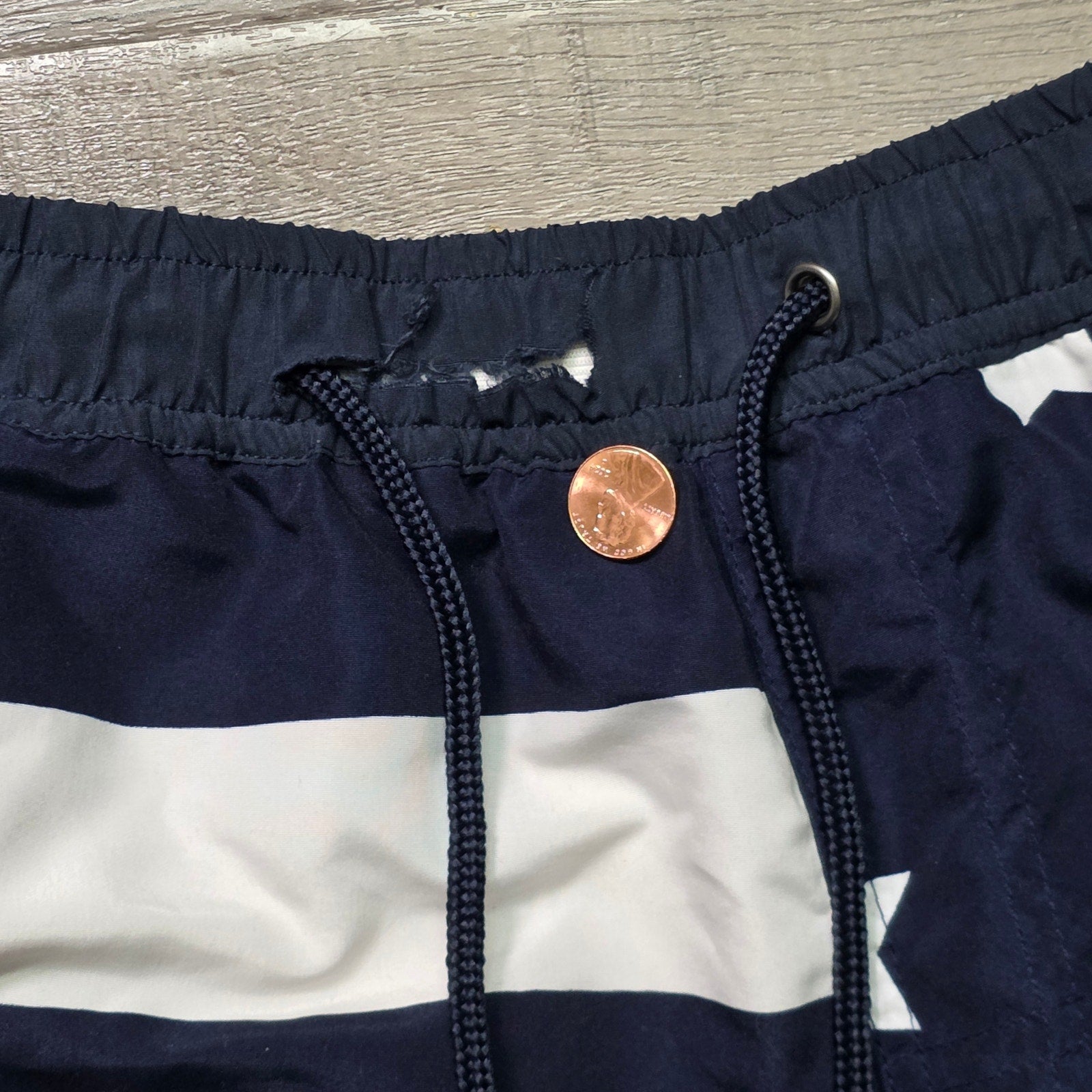 Patriotic US Polo Assn men’s swim board shorts in red, white, and blue with star and flag design. Perfect for summer, pool days, or 4th of July wear. Please note: there is a rip in the front near the drawstrings (see photos). Still wearable as-is or could be repaired.
