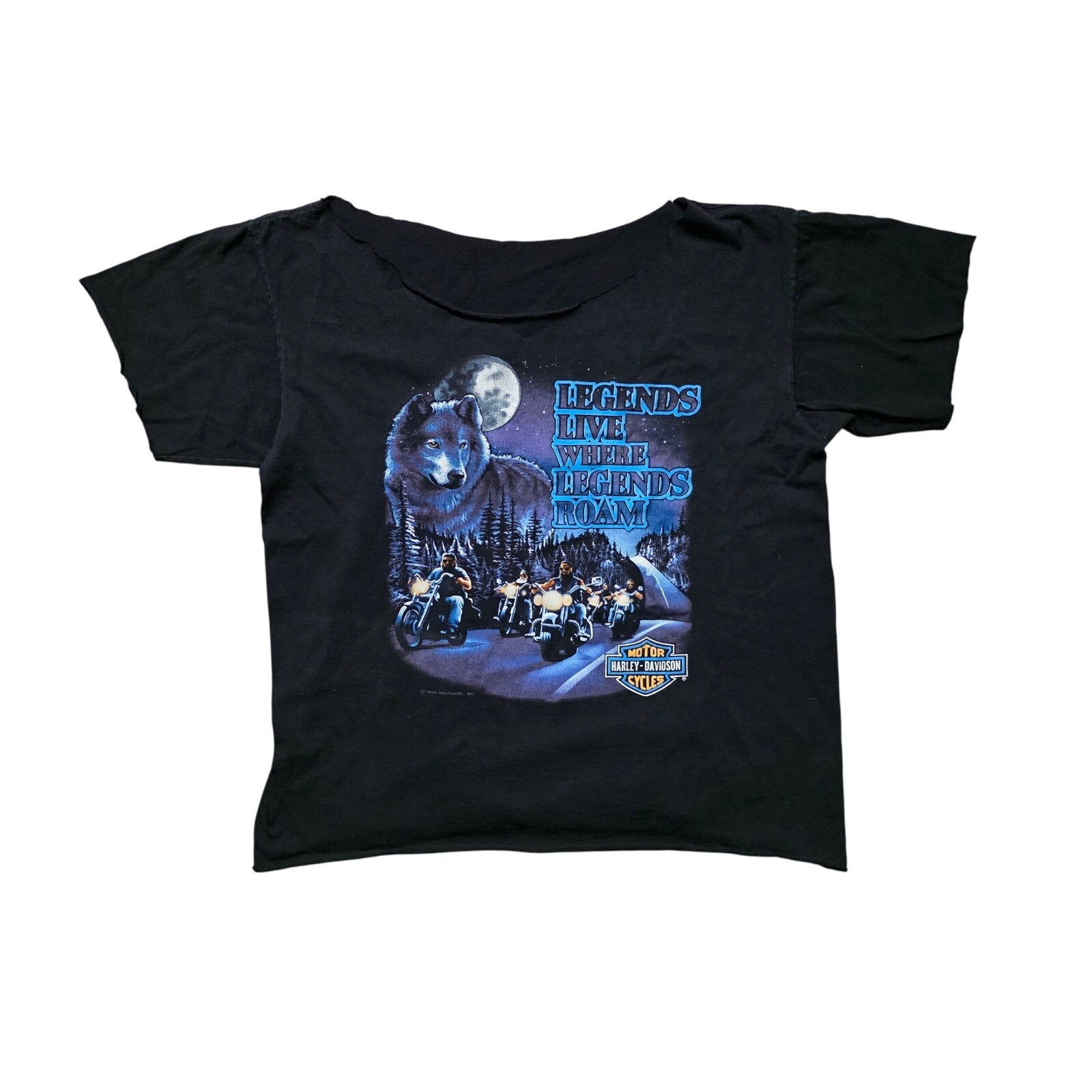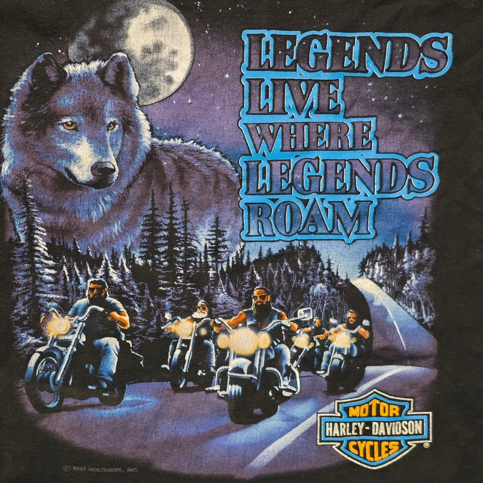 Vintage 1990s Harley Davidson graphic tee featuring a wolf and biker rally design with the quote “Legends Live Where Legends Roam.” Soft and thin 50/50 cotton/poly blend with a naturally distressed look from age. Perfect for collectors or vintage streetwear style.