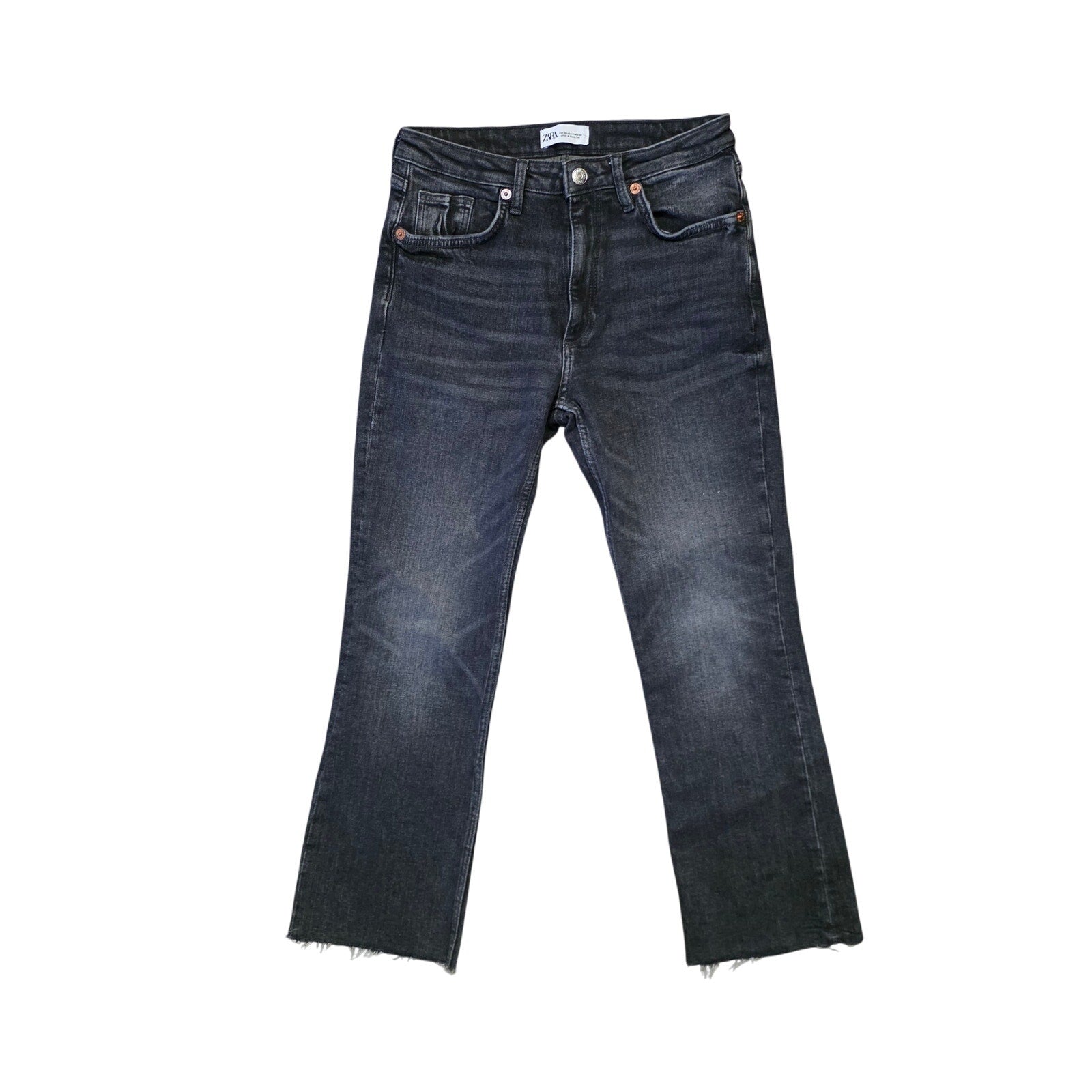 Zara washed black straight leg jeans in a versatile mid-rise fit. Classic everyday denim with a worn-in look that pairs well with casual or dressy tops.