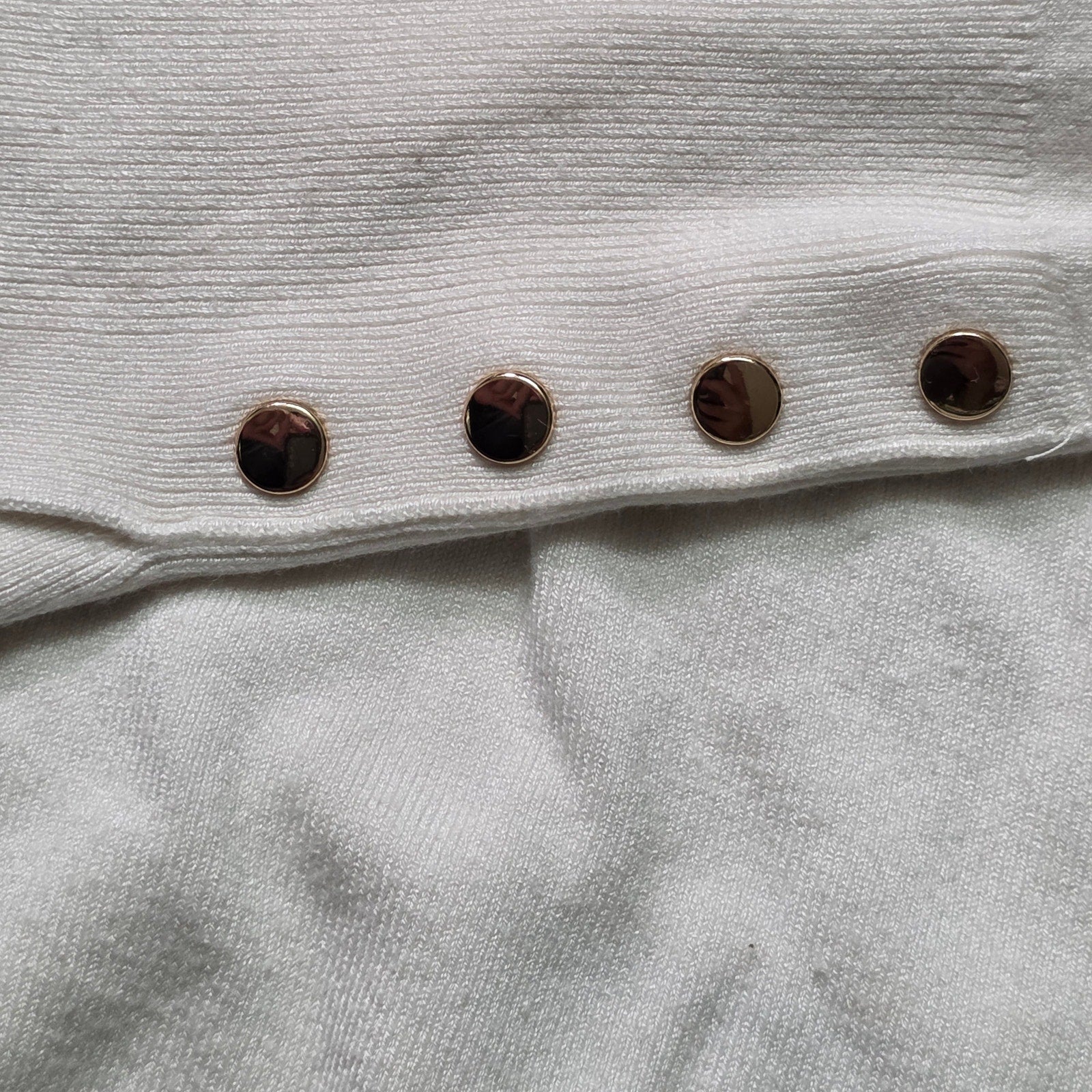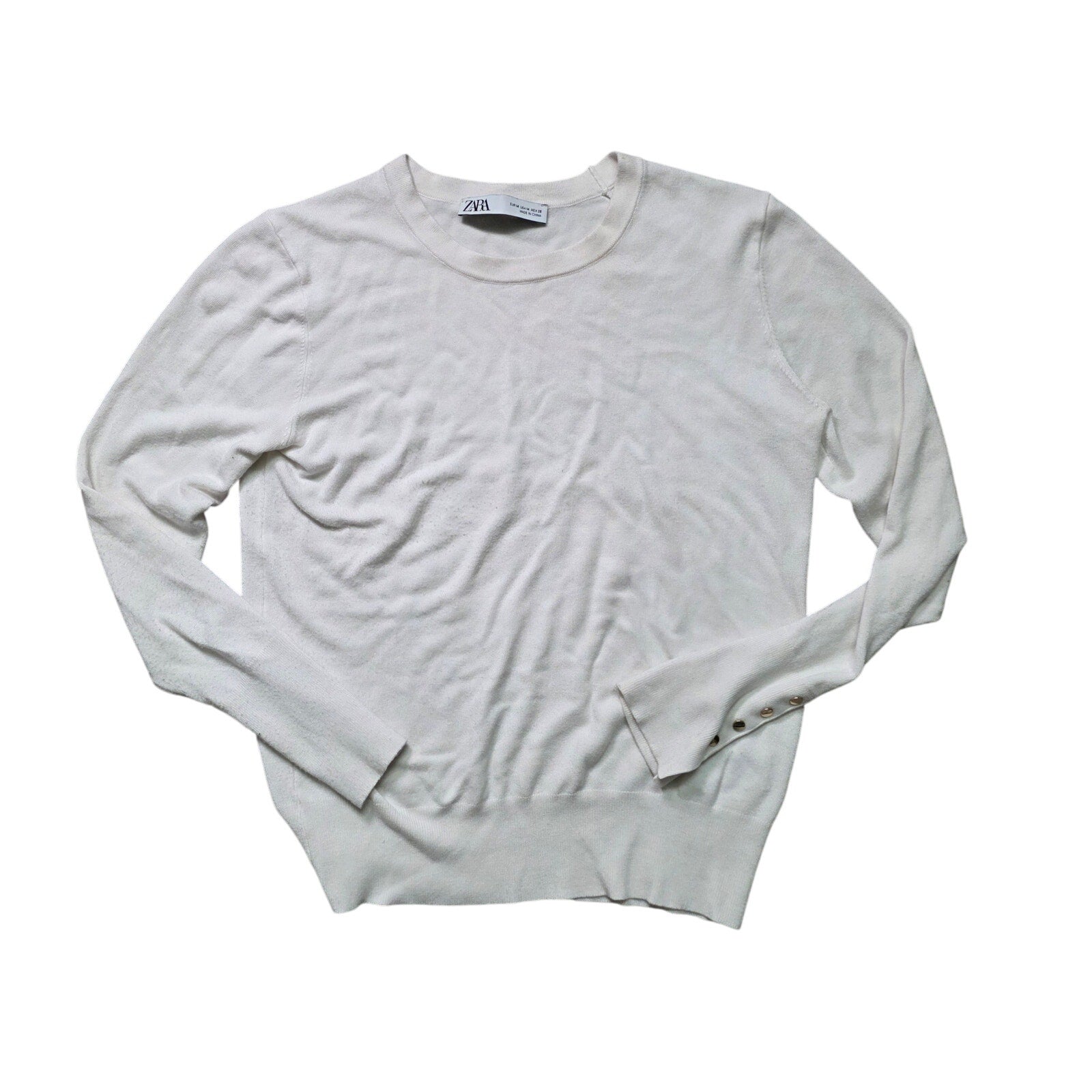 Soft off white Zara sweater with button detailing on the sleeves. Classic pullover style that works well for layering or casual wear.